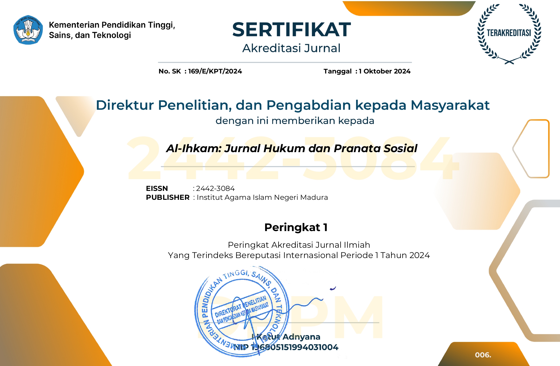 - Authors are permitted to disseminate published articles by sharing the link/DOI of the article at Al-Ihkam: Jurnal Hukum dan Pranata Sosial. Authors are allowed to use their articles for any legal purposes deemed necessary without written permission from Al-Ihkam: Jurnal Hukum dan Pranata Sosial with an acknowledgment of initial publication to this journal.