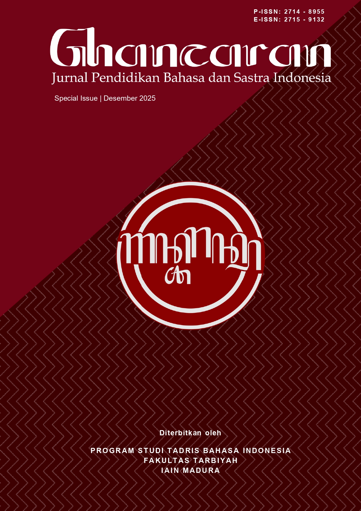 Ghâncaran: Jurnal Pendidikan Bahasa dan Sastra Indonesia received 15 research articles in this edition, written jointly by 34 authors. The authors are geographically spread across various regions of Indonesia and come from various affiliations, including universities, research institutions, and others. The authors' affiliations include UIN Sayyid Ali Rahmatullah Tulunggaung; Islamic University of Malang; Sananta Dharma Yogyakarta; Gadjah Mada University; PGR Ronggolawe Tuban University; National Research and Innovation Agency; Brawijaya University; UIN Syarif Hidayatullah Jakarta; Walisongo State Islamic University Semarang; Trunojoyo Madura University; Makassar State University; Timor University; Surabaya State University; STKIP PGRI Sumenep; Mataram State University; Yogyakarta State University. In this edition, there are 2 articles written in English. The topics discussed include the dignity of the Indonesian language, reading and listening, educational pragmatics, Gerard Genette's narratology, gender language, literary ecocriticism, BIPA learning, phonemes, metaphors, curriculum, drama, Marxist studies, ethnolinguistics, critical discourse analysis, and others.