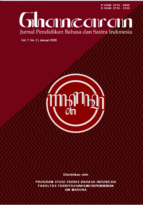 Ghâncaran: Journal of Indonesian Language and Literature Education Vol. 7 No. 2 (2025) features 20 selected high-quality manuscripts that represent a rich diversity of perspectives and the latest developments in the fields of language, literature, and education. This issue brings together contributors from several countries, including Indonesia, Malaysia, the United Arab Emirates, China, and Thailand, reflecting the journal’s expanding international reach and academic reputation. The published articles address contemporary and relevant topics, ranging from studies on glottal stops, ethnolinguistics, and linguistic corpora to critical approaches such as ecocriticism, gastrociticism, cybersastra (cyber literature), feminist literary criticism, and studies on literary psychology and gender. In addition, several manuscripts explore mental health discourse in literature and education, enriching academic discussions through interdisciplinary perspectives. Overall, this issue reaffirms Ghâncaran’s commitment to serving as a scholarly platform that is responsive to disciplinary advancements and to the evolving socio-cultural dynamics within Indonesian language and literary studies.